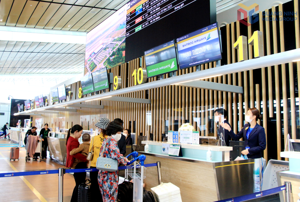 Hành khách thực hiện thủ tục lên máy bay tại Cảng hàng không quốc tế Vân Đồn.
